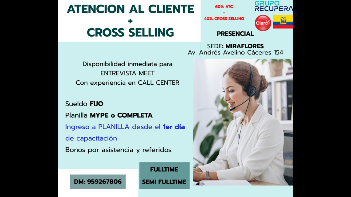 Presencial / Asesores de Cross Selling/ Call Center / Claro Ecuador / planilla desde el 1er dia