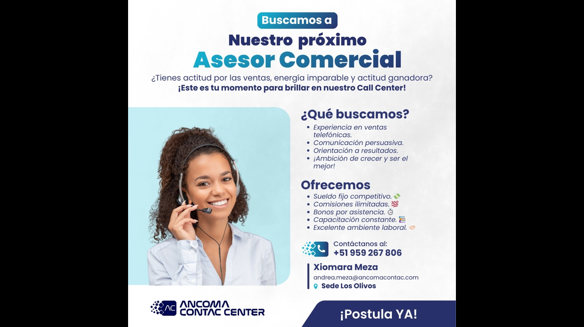 Actualmente nos encontramos en búsqueda del mejor talento para asumir el cargo de Asesor(a) de Ventas call center para el operador de Claro en la modalidad PRESENCIAL.